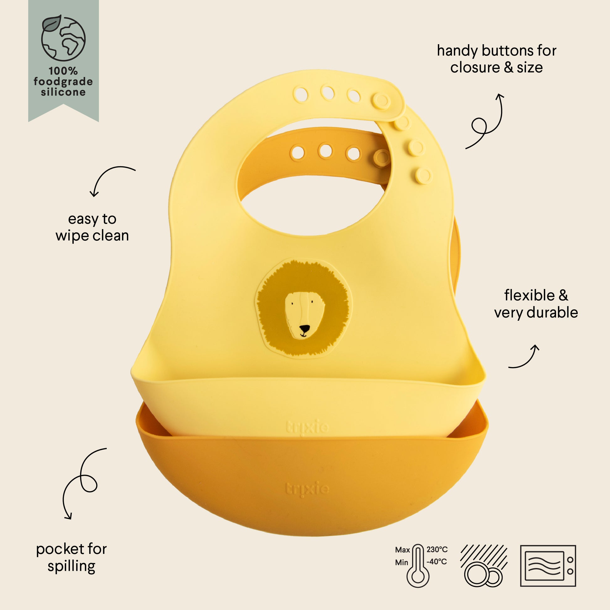 Divertimento e risate a tavola con questi graziosi bavaglini a forma di animale. Questi bavaglini sono un ottimo modo per proteggere i vestiti del tuo piccolo mentre mangia, beve o fa uno spuntino. La pratica tasca assicura che tutto il cibo versato venga raccolto ordinatamente, riducendo notevolmente il disordine! Il silicone è ottimo per l'uso in cucina. Non si rompe ed è sicuro da usare nel microonde, in lavastoviglie, nel congelatore e nel forno. Anche con un uso intensivo, le stoviglie rimarranno in buone condizioni e potranno essere facilmente passate a fratellini, sorelline o amichetti. Il silicone alimentare al 100% è conforme a tutti gli standard di sicurezza europei.