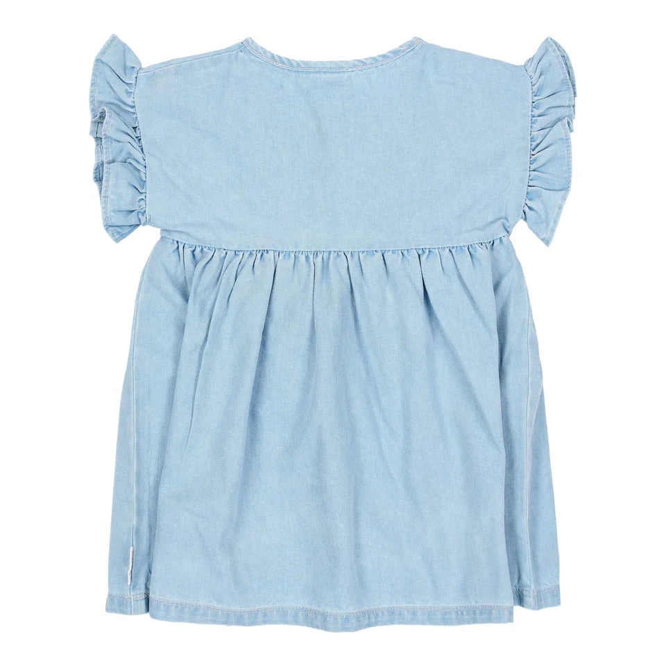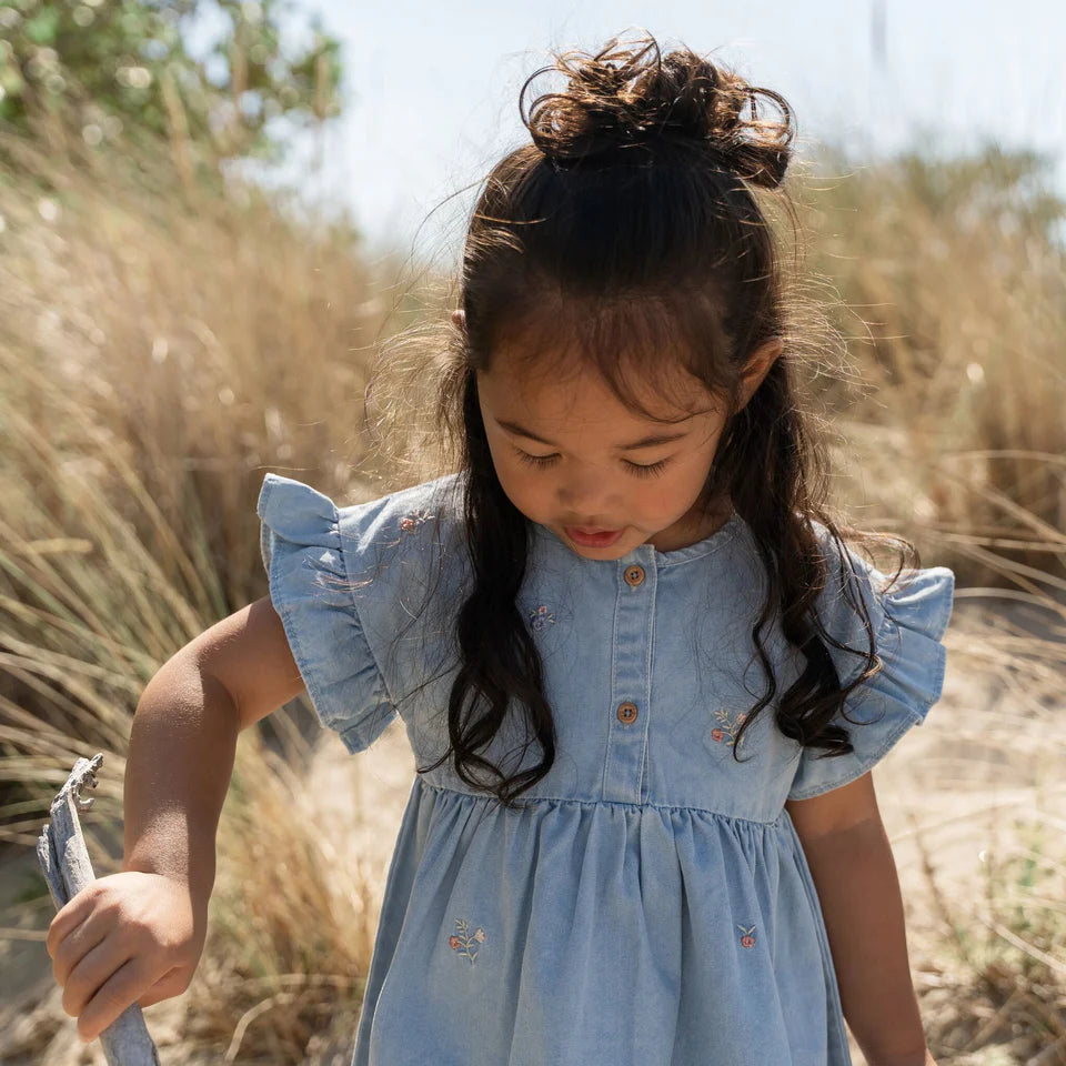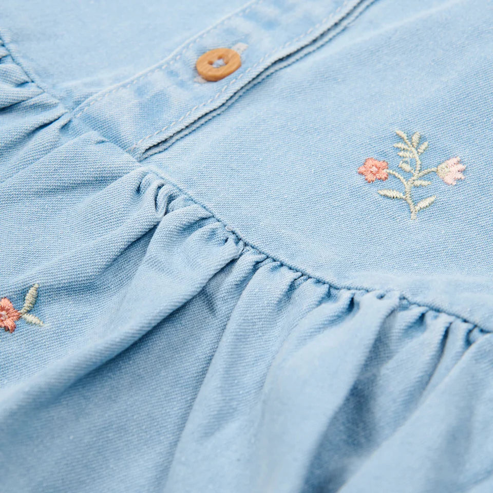 Lascia che il tuo piccolo brilli in questo simpatico abito estivo a maniche corte. Il morbido look denim, gli allegri fiori ricamati e le balze giocose rendono ogni giorno speciale. Realizzato in cotone biologico per una sensazione piacevole e confortevole. Perfetto per avventure al sole e divertimento senza fine.