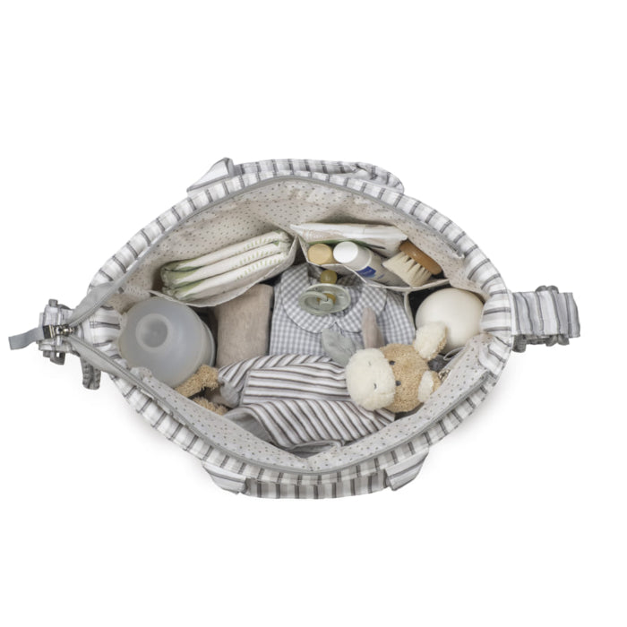 Borsa fasciatoio in cotone con stampa a righe per passeggino con fasciatoio incluso. Molto leggera, resistente e di grande capacità per trasportare tutto il necessario per la passeggiata con il bambino. È dotata di molteplici tasche per tenere tutto in ordine. All’interno ha una tasca laminata per i vestiti bagnati, una tasca termica per i biberon e due tasche per gli oggetti da tenere a portata di mano. La borsa è dotata di un sistema di aggancio universale, con 2 manici corti regolabili che la rendono facilmente agganciabile a qualsiasi modello di passeggino. Dispone inoltre di una tracolla lunga per appenderla alla spalla e di manici corti per tenerla in mano. Alta qualità e stile. Realizzato in 100% cotone con trattamento impermeabile, facile da pulire a mano o in lavatrice a 30°C. Walking Mum protegge il vostro bambino utilizzando i migliori tessuti, privi di coloranti azoici e di sostanze nocive per la salute. La nostra collezione Walking Mum è disegnata con un particolare timbro di stile urbano e moderno che non passa inosservato. Le borse premaman di questa linea sono sportive e pratiche, pensate appositamente per le mamme e i papà moderni che apprezzano i design più attuali e di tendenza senza trascurare la qualità e la funzionalità degli accessori che completano e rendono più confortevoli tutte le passeggiate con il proprio bambino. Specifiche: Materiali: 100% cotone con trattamento waterpfoof. Misure: 44x29x12 cm.