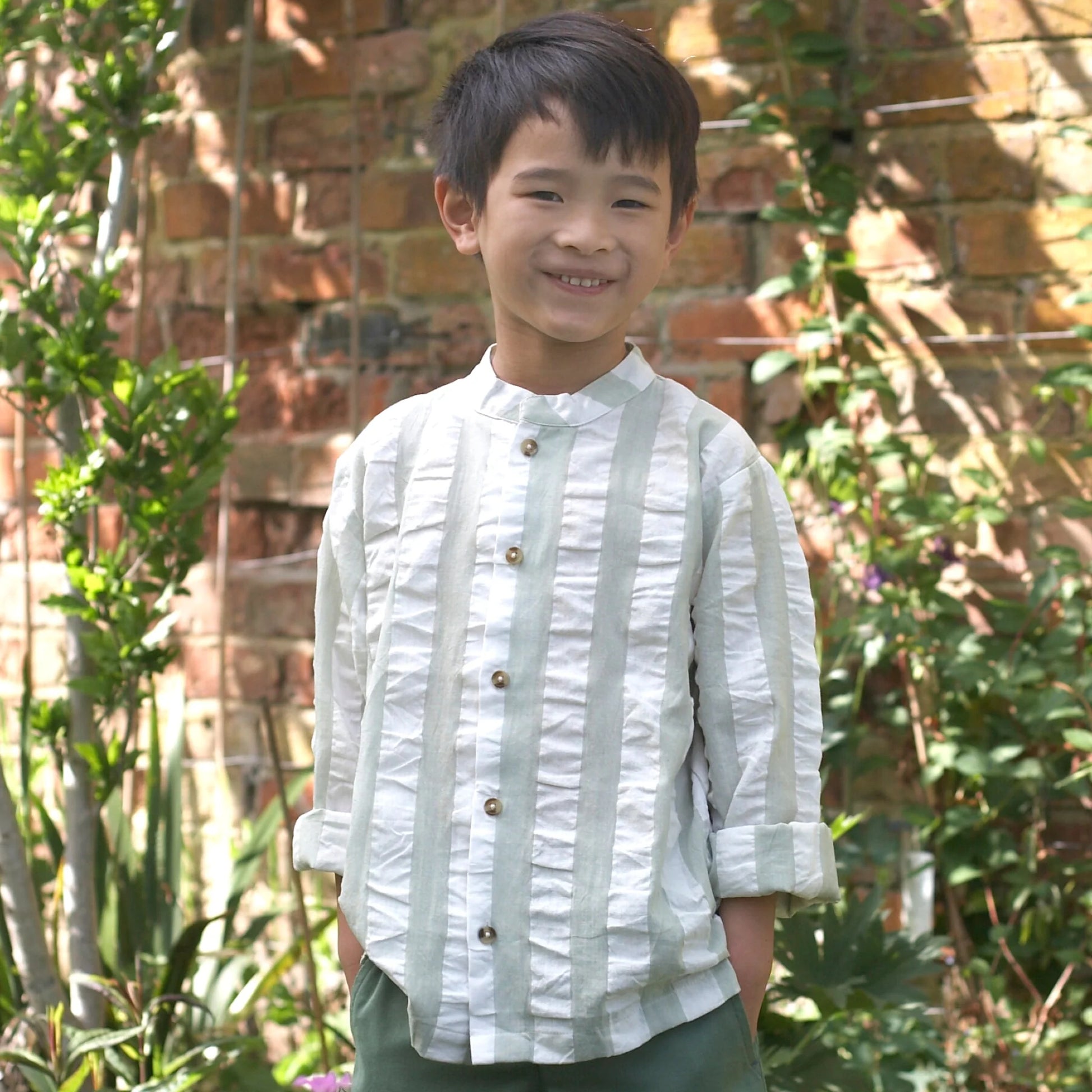 Camicia Seersucker senza colletto -Verde Pigeon