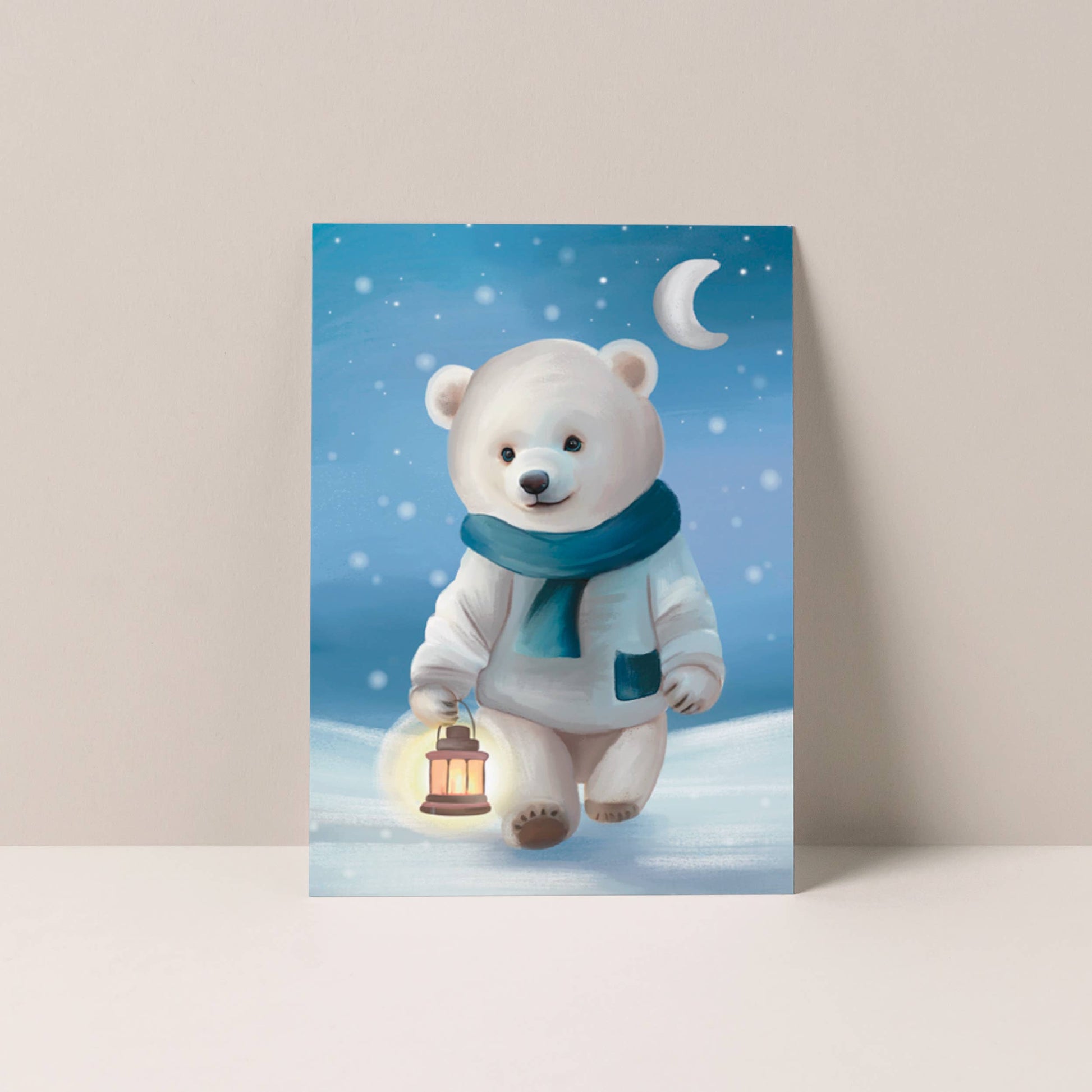 Caro orso polare con sciarpa e lanterna, cammina nella neve sotto la luce della luna. Adatta anche come cartolina di Natale! Collezione di cartoline fantasiose, con molti colori. Perfetta da inviare ma anche bellissima per un angolo in casa. Oppure in una cornice nella stanza del bambino o del neonato. Tutti i prodotti sono disegnati a mano con amore e progettati da Studio Poppybird e stampati presso una tipografia olandese.