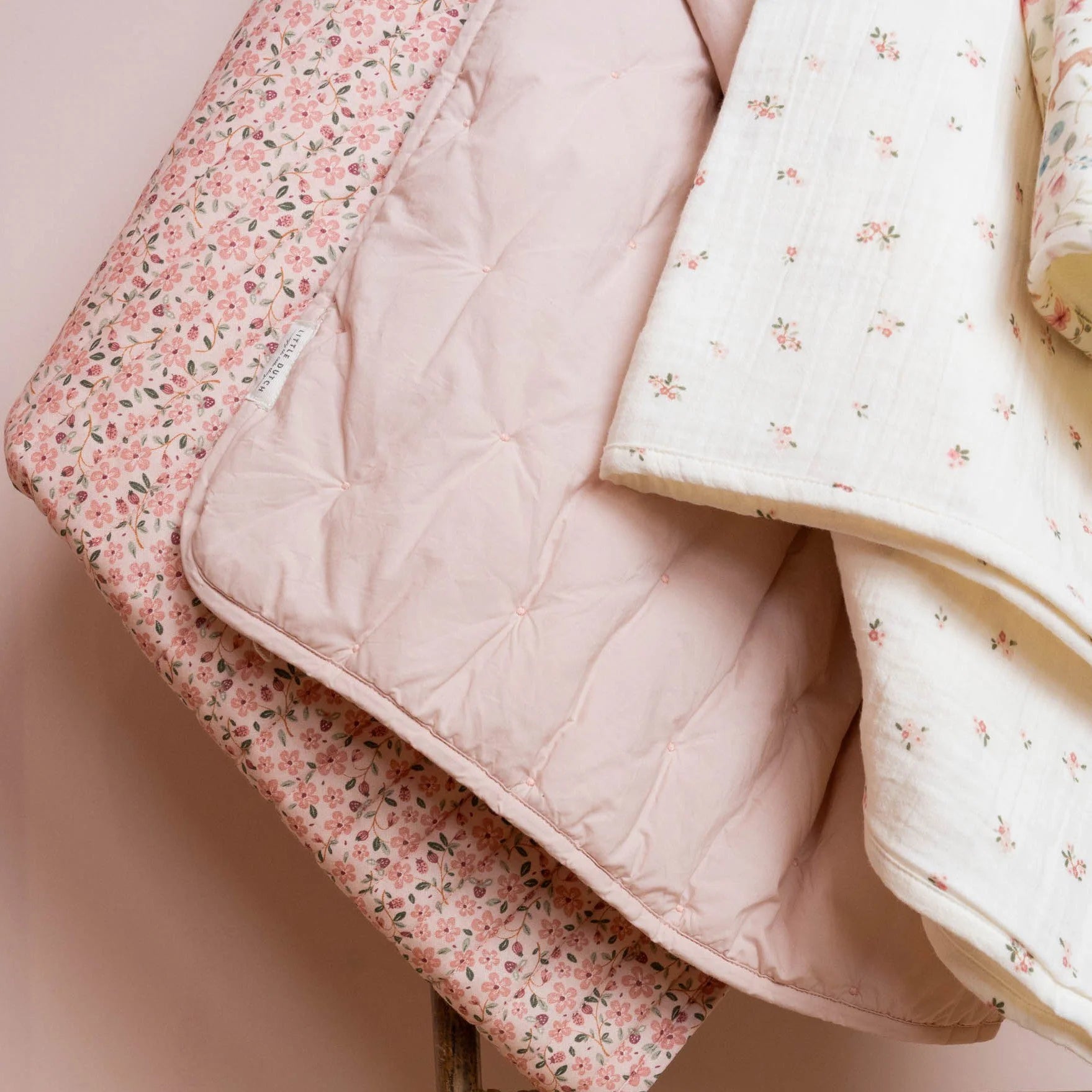 Copri il tuo bambino con il calore e la sicurezza di questa coperta da letto idrofila a 4 strati per i sogni più dolci. Il cotone biologico 100% prelavato e stropicciato di cui è realizzata la coperta garantisce la massima morbidezza, assorbimento dell'umidità, traspirabilità e comfort, rendendola ideale per la stagione estiva. È anche piacevole da usare come morbida superficie per prendersi cura del tuo piccolo, sia a casa che in viaggio. I graziosi fiorellini che danzano sulla superficie bianca spezzata del design Fairy Blossom raffigurano l'avventura di un giardino pieno di fiere e portano calore e conforto ai sogni del tuo piccolo.