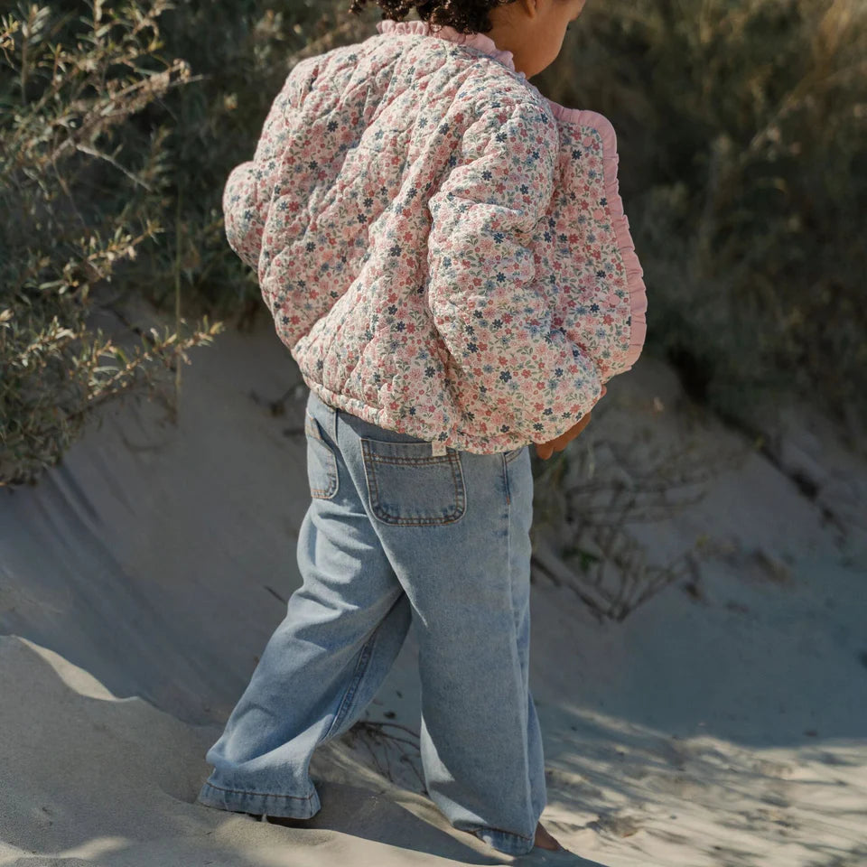 Questi pantaloni estivi da ragazza sono realizzati in morbido cotone biologico e presentano un'allegra cintura floreale in vita. Il modello a gamba larga garantisce maggiore comfort e libertà di movimento. Abbinalo a un top o una giacca con la stessa stampa per un look dolce e giocoso. Perfetto per giornate di sole piene di avventura e scoperta.