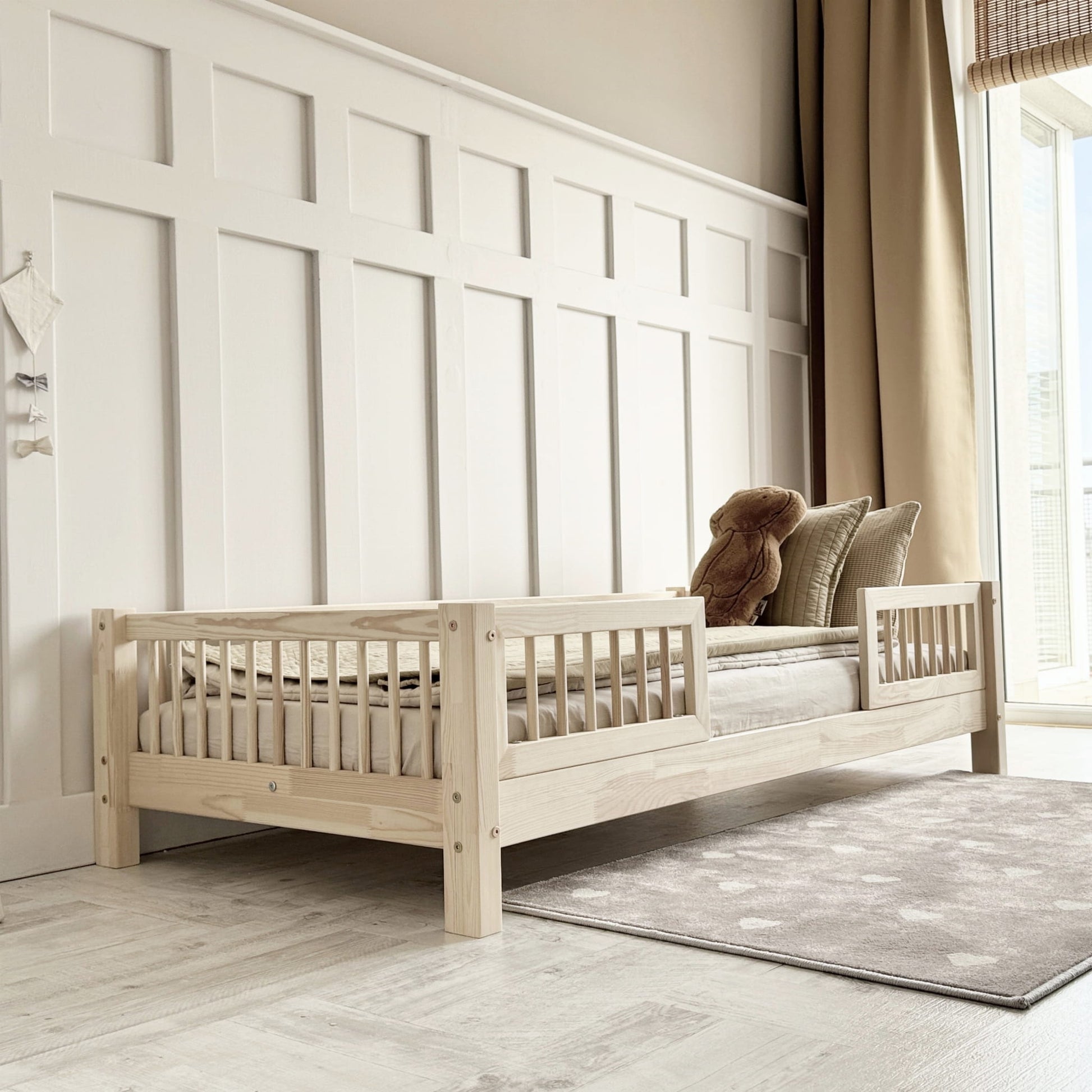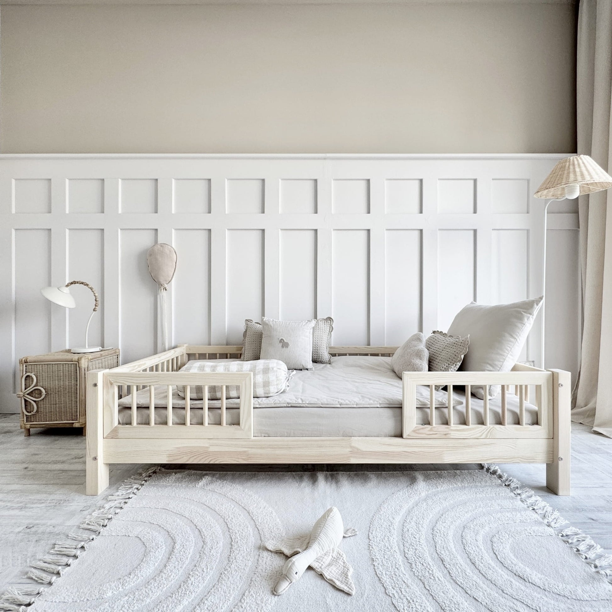 Acquistando il modello BASIC DUO CON SPONDA A GRADINI riceverai una struttura letto completa con base per materasso, travi verticali e il set di sponde presentato nelle foto.