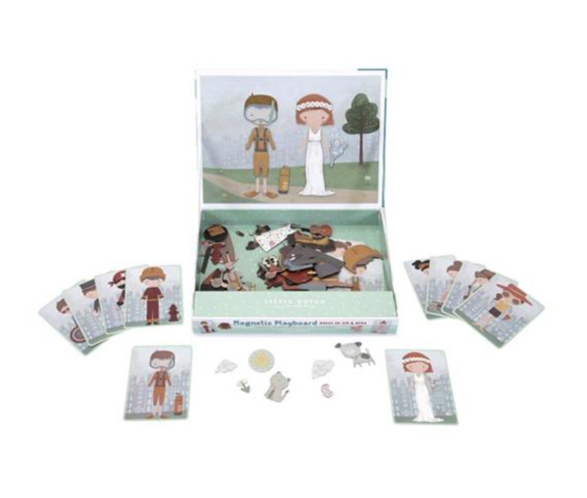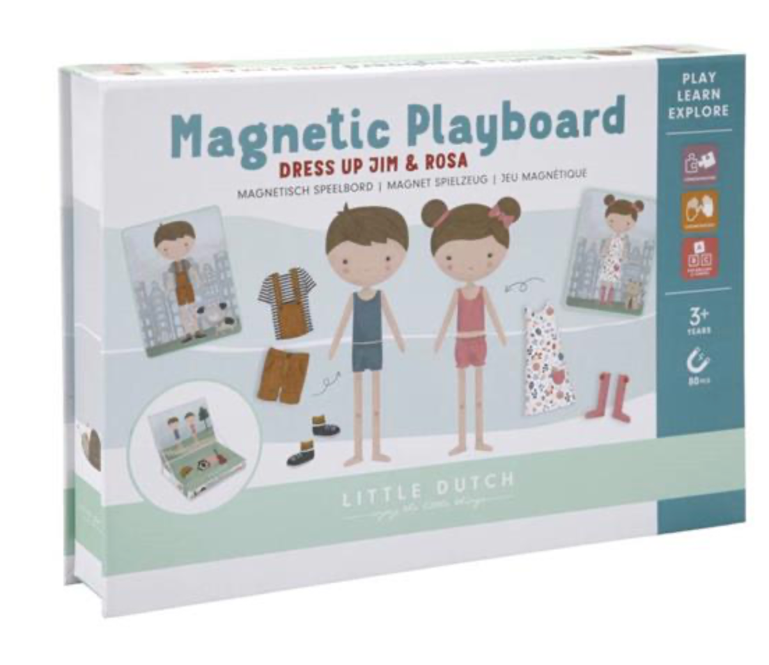 Gioca a vestirti con Jim & Rosa! Con questo puzzle magnetico puoi copiare gli abiti delle carte sulla lavagna con pezzi magnetici. Oppure usa la tua fantasia. Ci sono infinite combinazioni che garantiscono un sacco di divertimento mentre incoraggiano il vocabolario e la coordinazione. A casa, ma anche in viaggio.