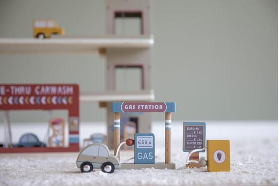 Fermati al garage per fare il pieno di benzina, parcheggia la tua auto o falla pulire all'autolavaggio. L'estensione include un garage con autolavaggio, auto, elicottero, stazione di servizio, pompe, cartelli e dipendenti. Il garage in legno è uno dei tanti set da gioco che possono essere collegati al set di treni Little Dutch XXL. Sul garage troverai una piattaforma per elicotteri e le figure di legno hanno un'illustrazione dettagliata su entrambi i lati. Completi il garage con il set di treni XXL e i set di estensione per ore di divertimento. Nessun pezzo di traccia è incluso in questo set.
