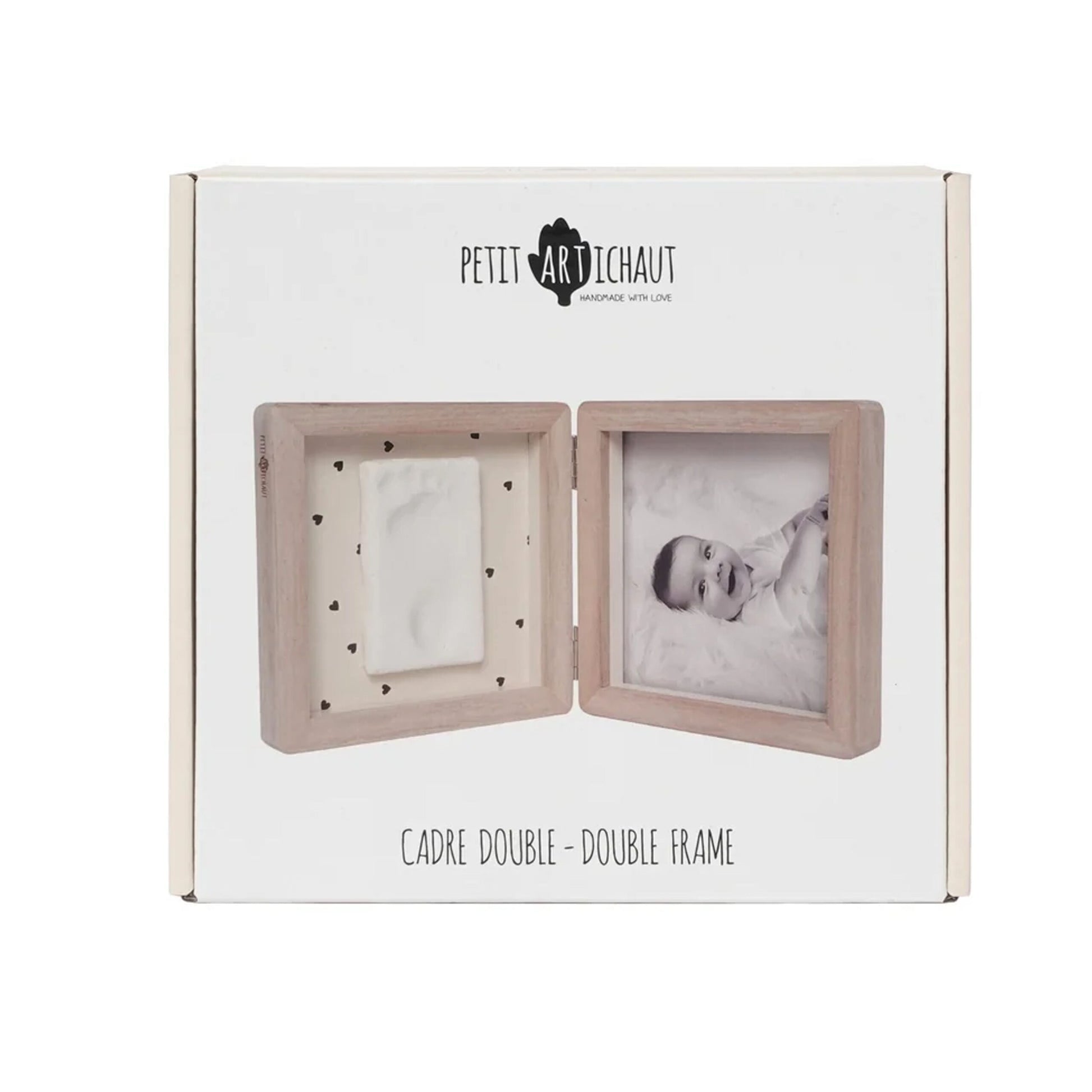Elegante cornice doppia firmata Petit Artichaut, pensata per conservare con dolcezza due preziosi ricordi: una foto del tuo bambino e l’impronta della sua manina o piedino. Ideale come regalo di nascita o baby shower, è un complemento raffinato per la cameretta.