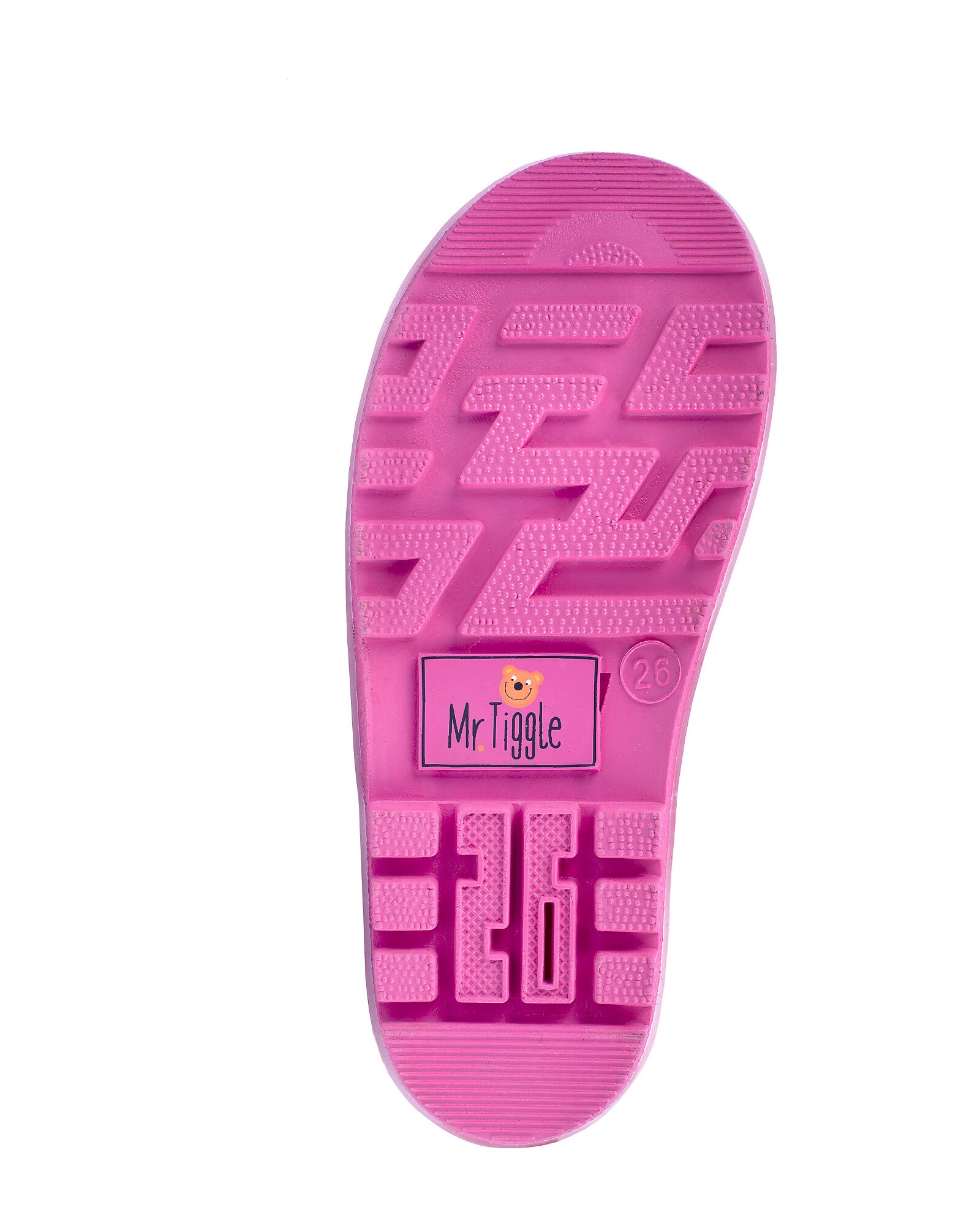 Stivaletto antipioggia Mr. Tiggle fantasia Unicorno con Arcobaleni con pratiche maniglie per essere indossato facilmente, come un gioco. Realizzato in gomma al 100%, fodera in cotone biologico. Pratico, divertente e una prova di acquazzone!