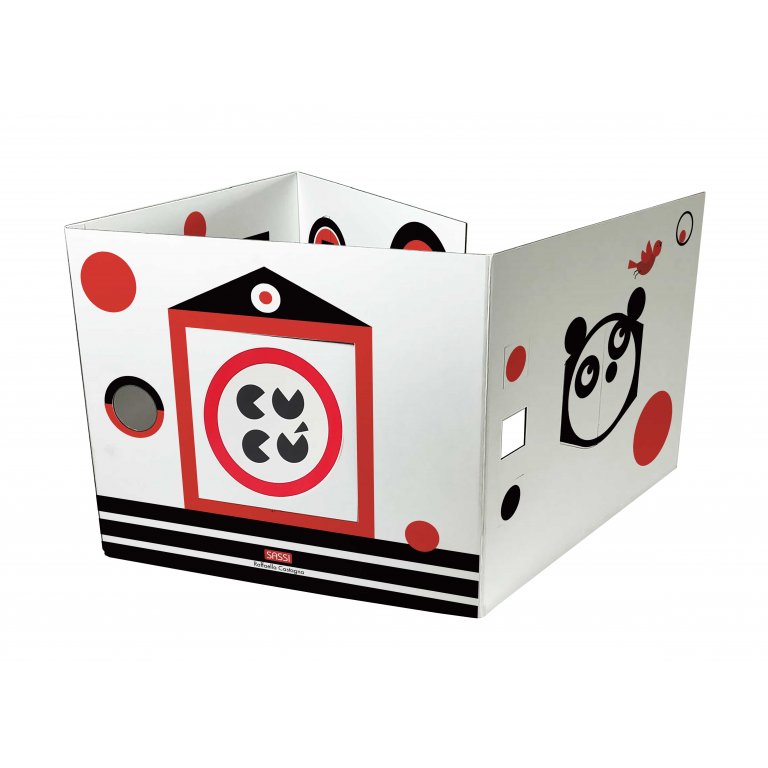 Con la sua apertura a portafoglio, permette di creare uno spazio interattivo per il bambino che, pur non riuscendo a stare seduto da solo, inizia a distinguere i primissimi colori (bianco, nero e tocchi di rosso). Finestrelle di varie dimensioni, figure geometriche e persino uno specchio, ma soprattutto sagome in bianco e nero con dei tocchi di rosso, che sfruttano il concetto dell’alto contrasto, ricreano uno spazio creativo unico che favorisce un ottimo primissimo approccio all’oggetto libro.