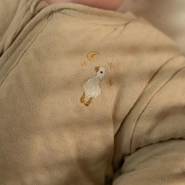 Mantieni il tuo piccolo al caldo e al caldo quest'inverno con il sacco nanna invernale Little Dutch in un elegante beige tenue. Realizzato in lussuoso tessuto jersey jacquard e cotone biologico al 100%, è meravigliosamente morbido. Il grazioso ricamo a papera sul petto aggiunge un tocco di fascino, mentre il fondo arrotondato e le maniche staccabili sono pratici e comodi. Perfetto per le notti fredde e i dolci sognatori. C'è una patta sopra la cerniera per proteggere la pelle delicata del bambino.